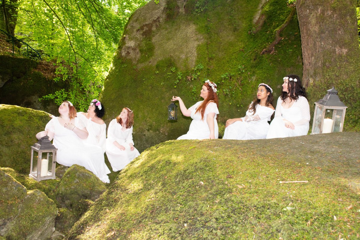 Marche diurne parmi le chaos rocheux et les chants de l’eau vive pour les modèles de l’association, parées comme les nymphes du bois légendaire d’Huelgoat.