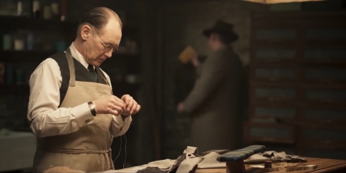 Chaque moment dans l’atelier est une véritable master class, mêlant ASMR et fétichisme textile. Avec ses tons crèmes et ocres comme du papier kraft, le lieu a bien été mis en valeur par la décoratrice Gemma Jackson. On y partage la solitude de Léonard mais aussi le havre d’une paix besogneuse.