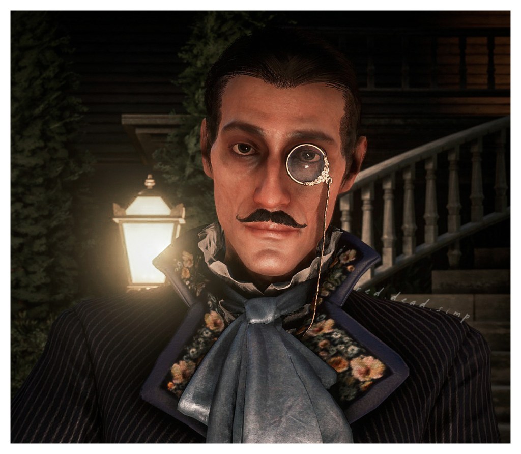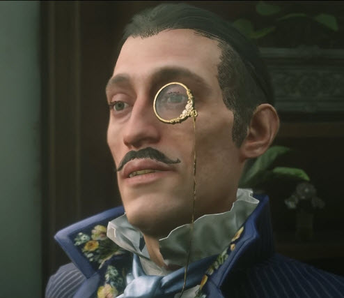 On rencontre Algernon Wasp pour la première fois après avoir terminé la mission principale ‘The Gilded Cage‘(La Cage Dorée) dans le chapitre 4 du jeu. Très pittoresque d’apparence, il arbore un monocle en métal ciselé, un foulard de soie noué à la croate et une redingote à col brodée de motifs floraux avec de fines rayures.