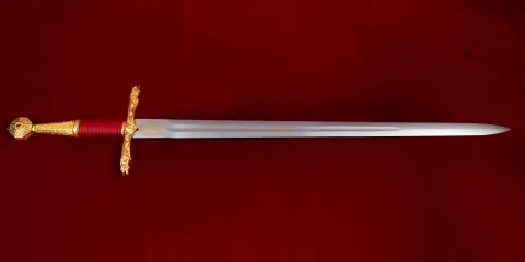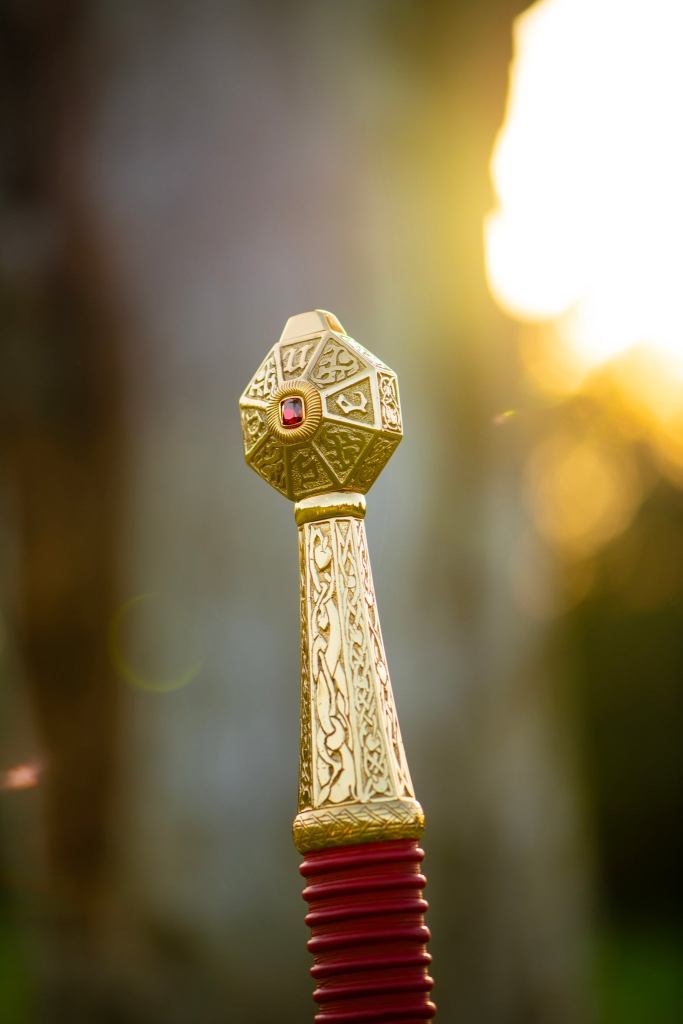 La présence du triskèle sur la garde et d’une croix nimbée sur la lame évoque la dimension sacrée et rituelle de l’épée.