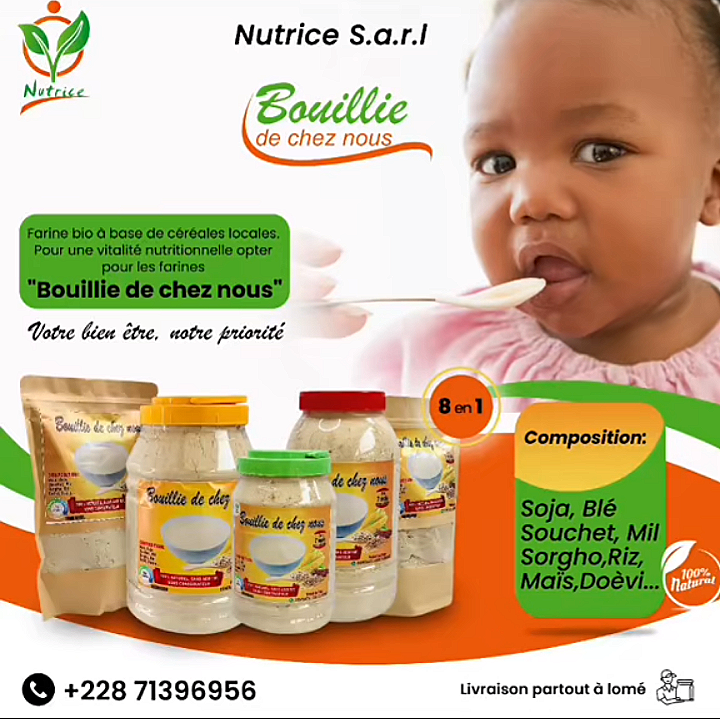 Nutrice, qui signifie nutrition à base de céréales, a vu le jour avec un tout premier produit : « Bouillie de chez nous », des farines 100 % naturelles, fabriquées à base de céréales produites sur le sol togolais.