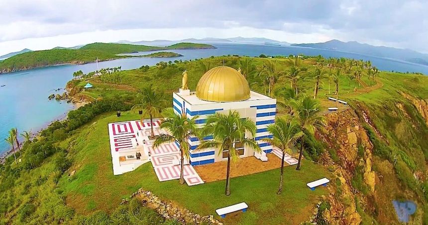 Summum de l’hubris et des travers iconoclaste du milliardaire, le temple qui surplombait l’île.