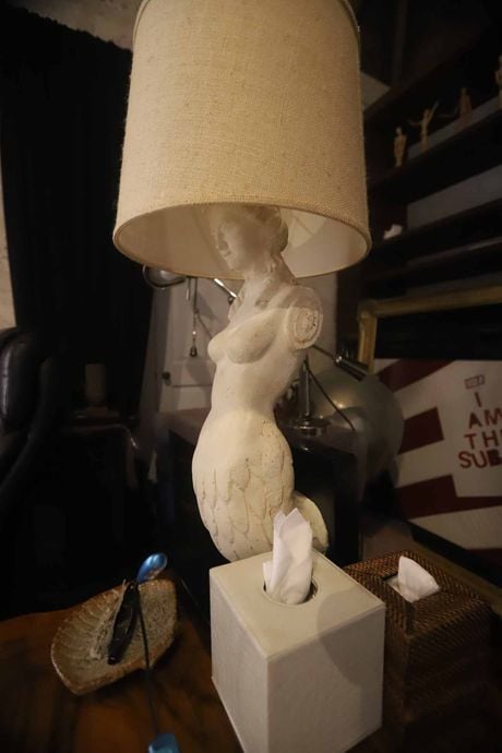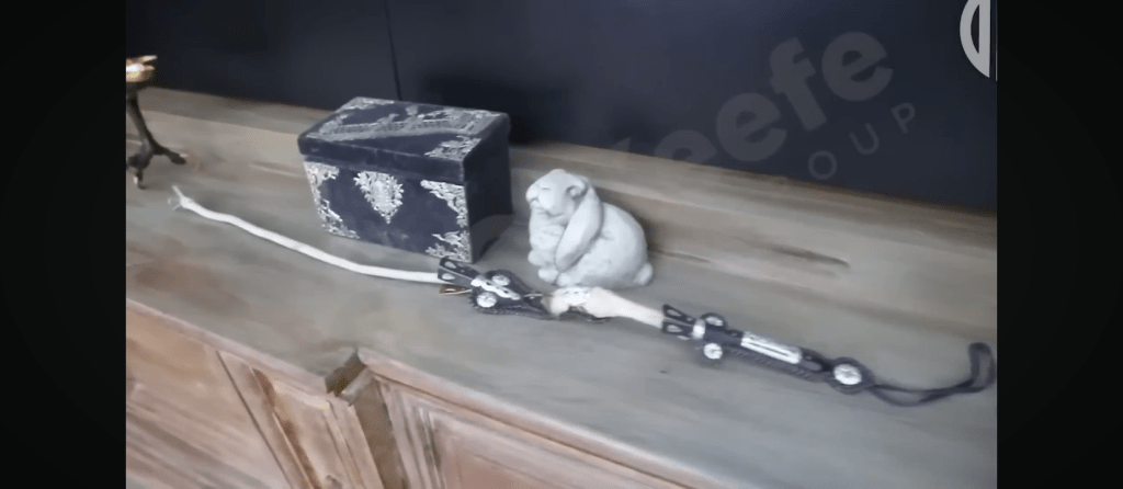 Dans le bureau d’Epstein : des fouets fabriqués en cuir et en os ; des sculptures d’anges noir portant des masques de corbeau ; de grotesques statuettes en porcelaine colorées contrastant avec l’austérité des lieux.