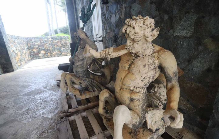 D’étranges statues, gardiennes de quelque mystérieux culte, semble poindre du sol ; des êtres mythologiques, notamment des ichthyocentaures – créatures marines mi-homme, mi-poisson – semblables à des copies romaines conservées au Vatican et au Louvre, représentant Silène, le satyre ivre, porté par une figure marine élégante.