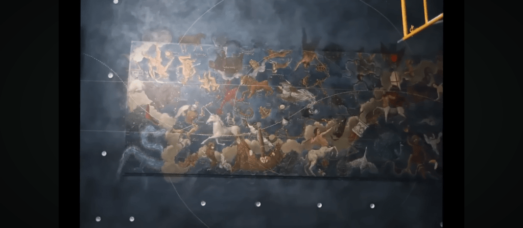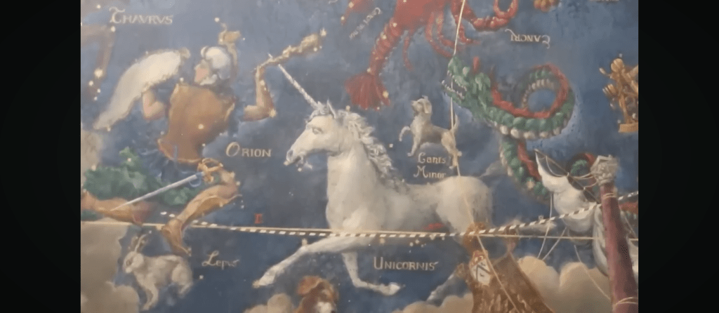 Dans la continuité de ce troublant zodiaque, une fresque de plafond dépeint un cosmos ; avec des constellations, des licornes, des lions, des centaures et des sentiers d’étoilés.
