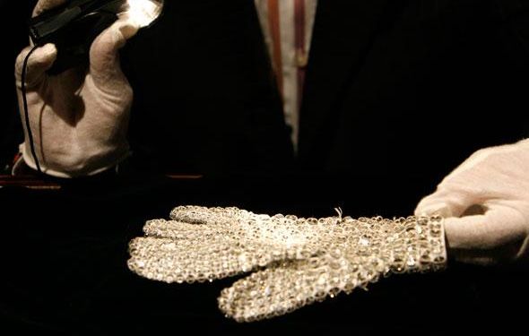 Il y a d’abord ce célèbre gant en cuir beige orné de strass porté lors du 25ième anniversaire de la Motown en 1983 ; le Roi de la Pop y a effectué pour la première fois en public son célèbre moonwalk lors de l’interprétation de « Billie Jean ».