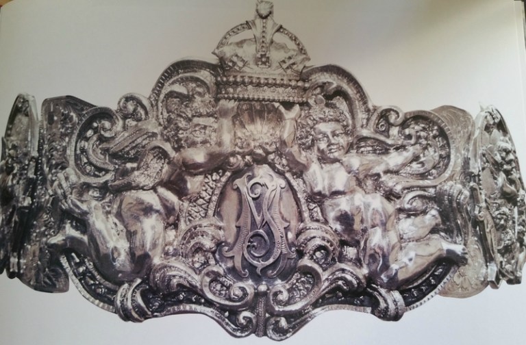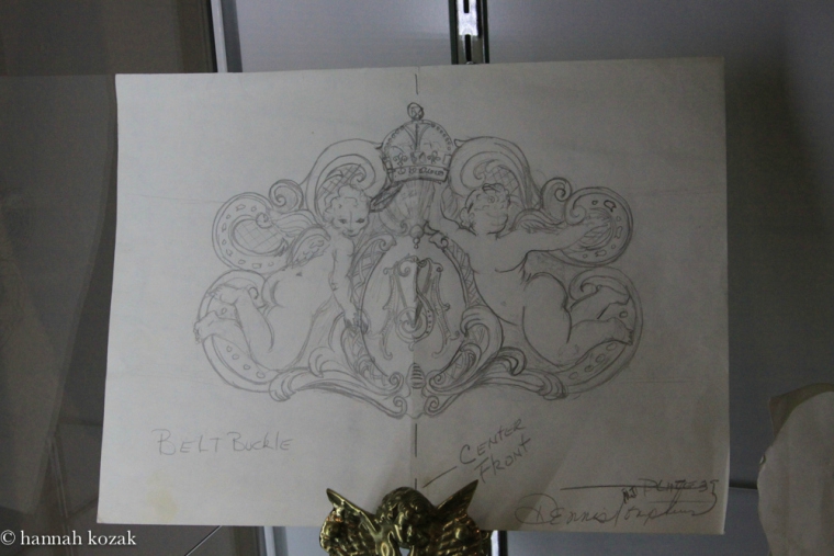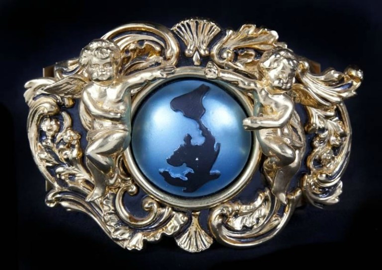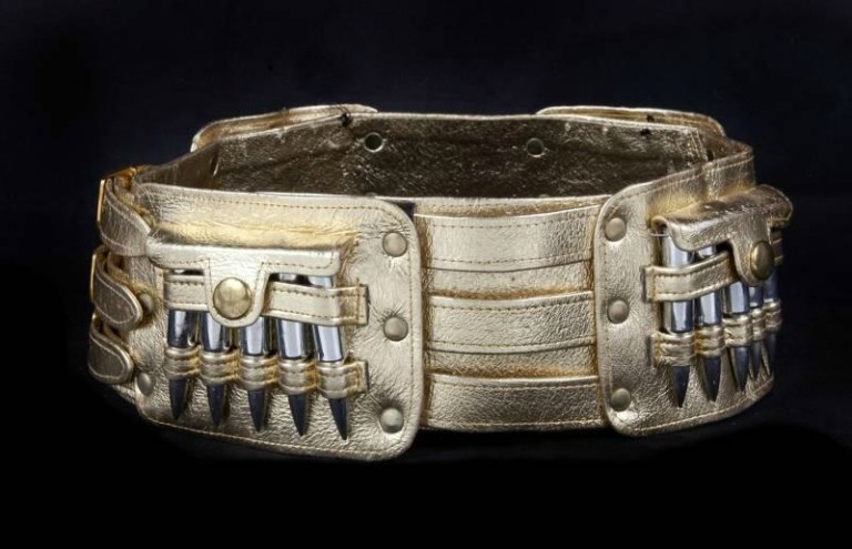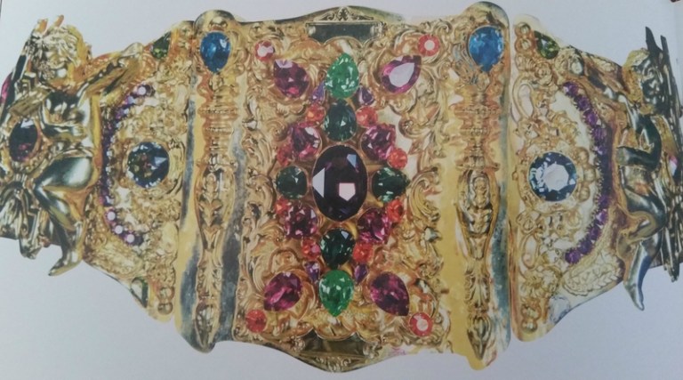 Pour l’accompagner, il lui créent une dernière ceinture, faite d’or 18 carats et incrustées de pierres larges semi-précieuses. Deux chérubins tenant une couronne sont insérés sur la boucle.